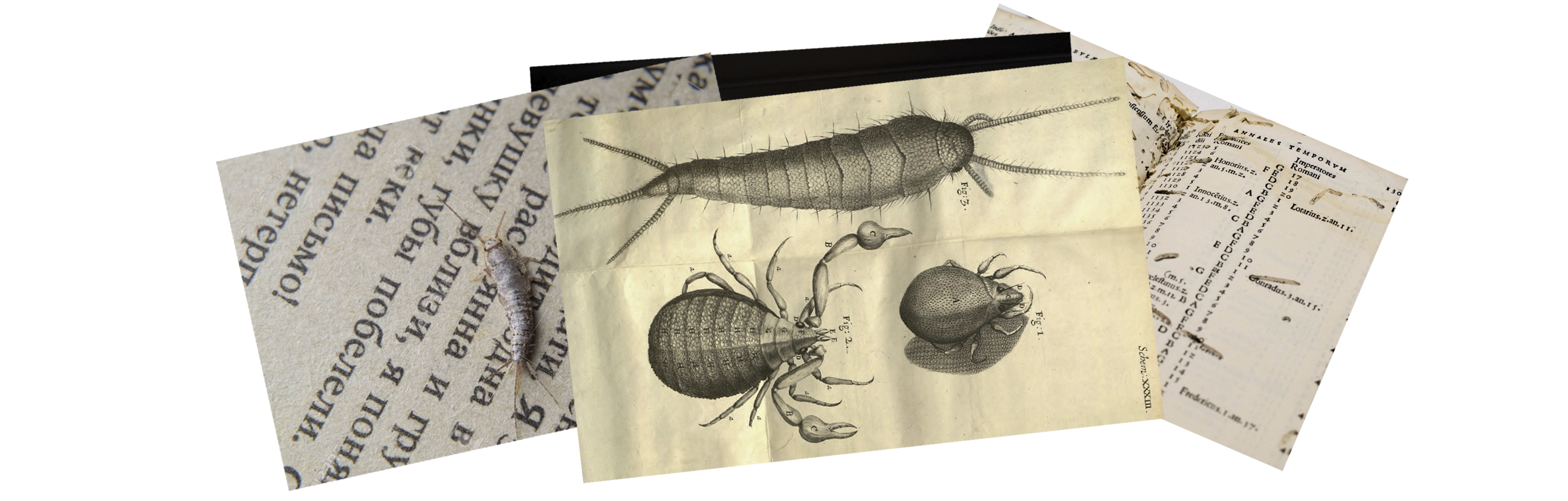 The silverfish is a dead and silent enemy of the books, it feeds on glue, silicons and celluloid. When a silverfish finishes eating the glue in the spine of the book, it jumps to another one. If it’s unable to jump to somewhere else, it starts eating the paper, first the margins, then the space between the lines creating amazing forms. The moment the silverfish accidentally eats a piece of paper with ink, poetically, it dies.